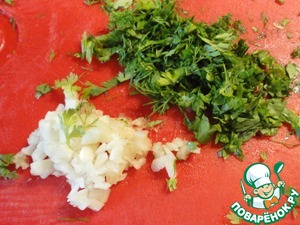 Тем временем подготавливаем остальные ингредиенты. Чеснок и зелень мелко рубим.
