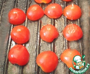 Поджаренные помидоры посыпаем порошком из соли с приправами (То, что перетирали в ступке заране). Это обязательно, иначе помидоры выйдут пресными на вкус.