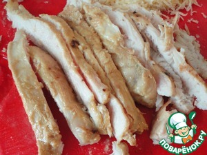 А тем временем готовим начинку. Куриное полу-филе режем на три части следующим образом. Отрезаем «малое филе», немного захватив большое. А «большое филе» разрезаем вдоль (по толщине) на два «стейка».