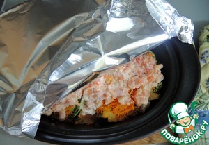 Помидор со сметаной выкладываем сверху на мясо и овощи. Накрываем форму фольгой и отправляем в духовку на 50 минут (температура 180 градусов).