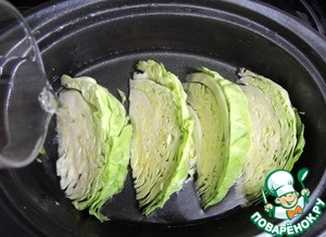 Капусту режем на большие куски. Выкладываем в форму, предварительно смазанную малом. Заливаем водой.