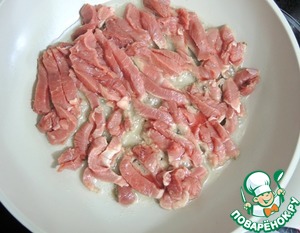 Мясо нарезаем некрупной соломкой. Обжариваем на хорошо разогретой сковороде в течение 2-3 минут.