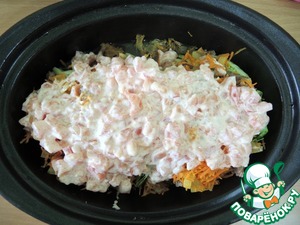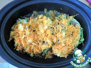 Лук и морковь выкладываем на мясо.
