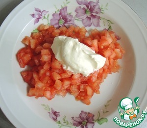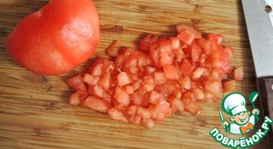 Обдаем помидор кипятком, снимаем кожицу. Нарезаем небольшими кубиками.