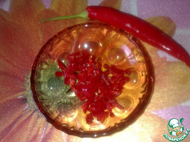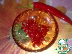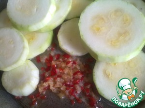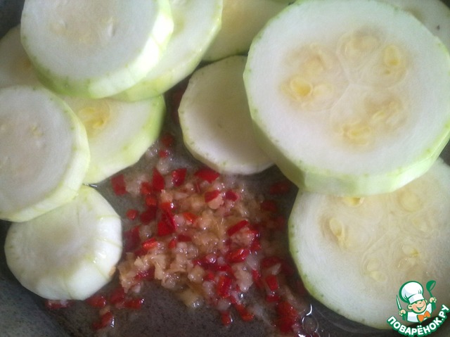 В сковороде разогреваем растительное масло, кладём перец чили, чеснок, имбирь и обжариваем 30 секунд.