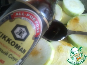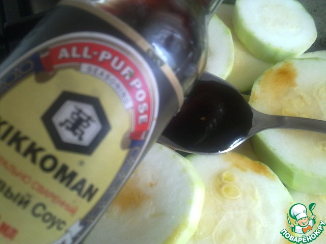 К кабачку добавляем соевый соус"Kikkoman", рисовый уксус, сахар. Всё хорошо перемешиваем и тушим 2 минуты.