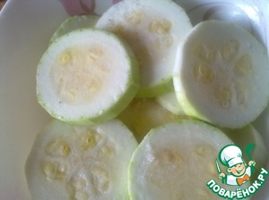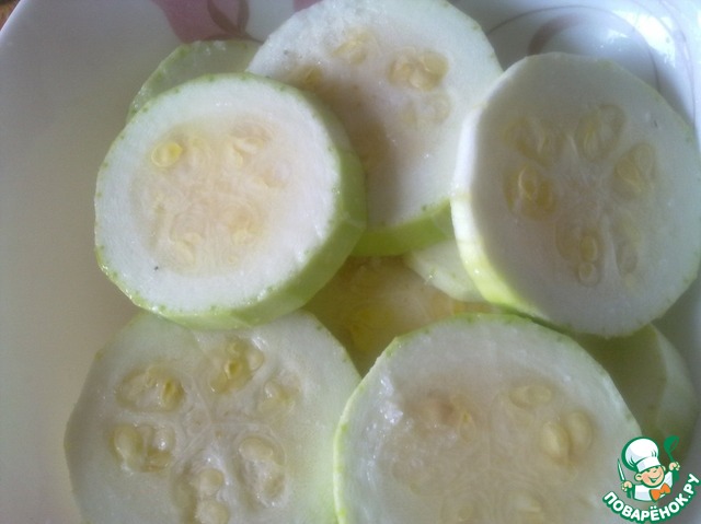 В большую чашку кладём нарезанный кабачок, посыпаем солью и оставляем на 20 минут.