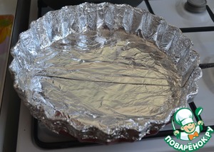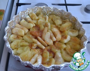 В идеале яблоки карамелизируются на сковороде в которой потом будет выпекаться пирог, но у меня нет сковороды со съемной ручкой, я выстелила форму фольгой ( честно – просто побоялась, что потом не отдеру эту карамель, напрасно боялась...)