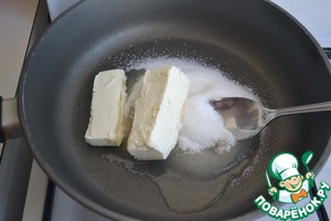 В толстостенную сковороду выложила масло, сахар и ликер ( в некоторых вариантах вода, в некоторых белое мускатное вино, – ликер это моя идея, хорошая, как оказалось)