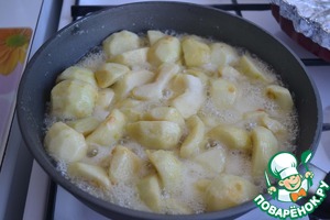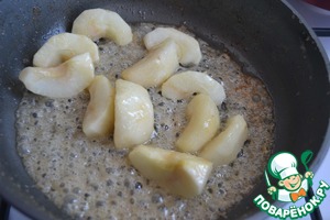 ЖАРИТЬ! Карамелизировать для меня слишком сложное слово, поняла я это тогда, когда яблочки начали становиться прозрачными и стремительно мягчеть. Мне показалось, что яблок мало и я дожарила еще два яблока, на этом фото отчетливо видна карамель в нужной кондиции.