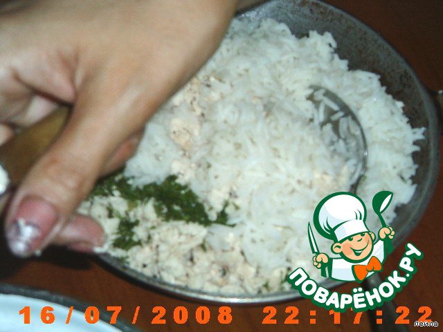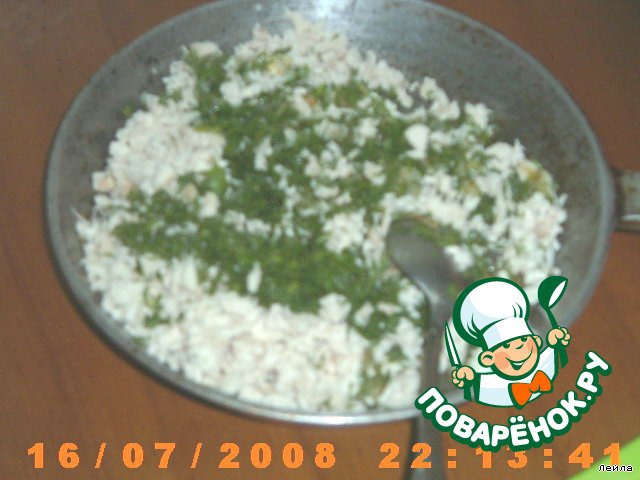 Положить отваренный, остуженный рис, посолить, поперчить. Начинка готова, начинаем лепить пирог.