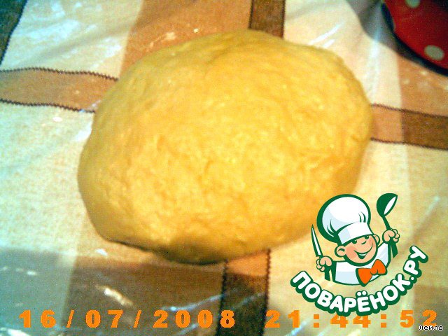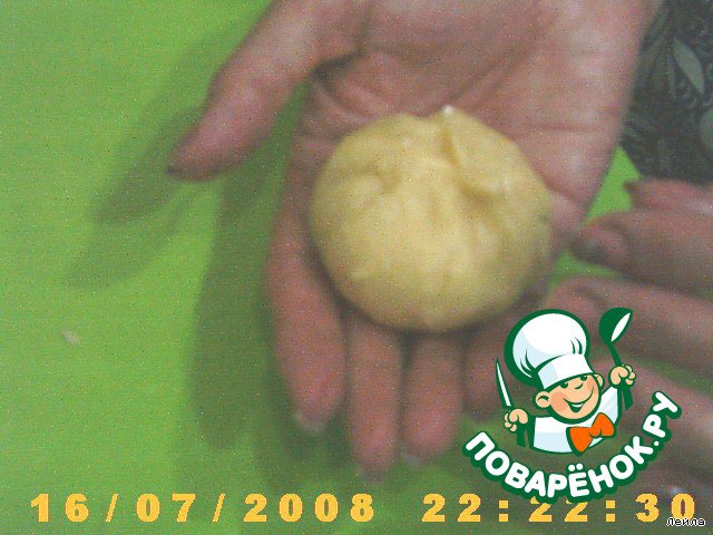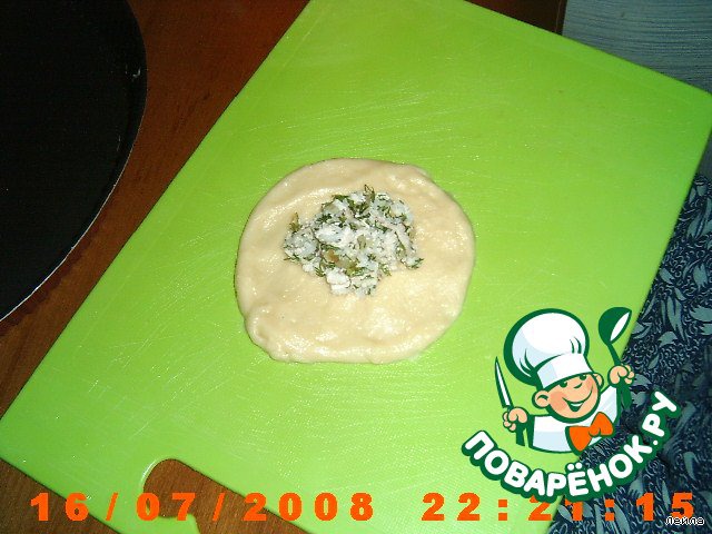 Тесто очень мягкое. Отрываем кусочек теста, пальцами (без скалки) делаем форму кружочка, кладем начинку,