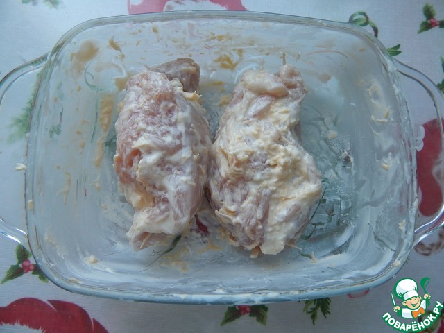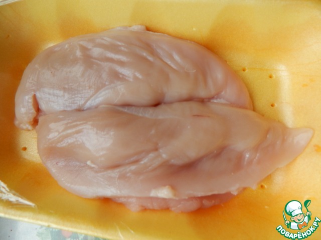 Для начала необходимо разделить грудку на 2 филе, посолить, при желании посыпать любимыми специями.