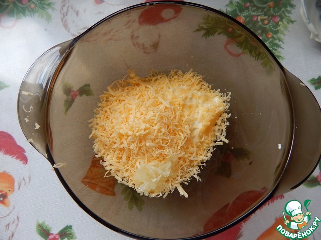 Приготовим соус: к сметане добавим сыр, измельченный на мелкой терке, и мелко рубленный чеснок.