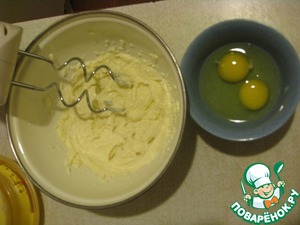 Размягченное сливочное масло смешиваем с сахаром и ванилью. Добавляем яйца и перемешиваем.