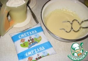 В ранее полученную смесь добавляем сметану и перемешиваем. Муку просеиваем, добавляем в нее разрыхлитель и постепенно вводим в масляно-яичную смесь. Замешиваем крутое тесто.