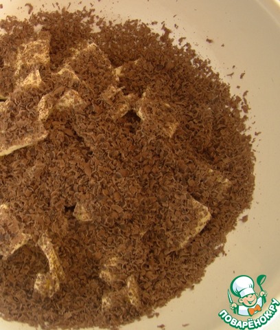 Режем сливочное масло кусочками и даем ему немного подтаять. Сверху трем на крупной терке 50 г (половину плитки) шоколада.