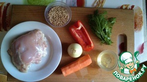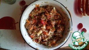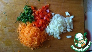 Пока наша крупа варится нарезаем наши овощи. Морковь натираем на терке, лук и перец- средними кусочками.