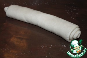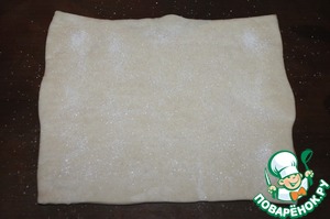 • Слоеное тесто разморозить. Каждый лист посыпать 1 ст. л. сахара.