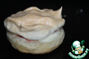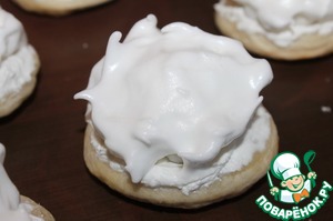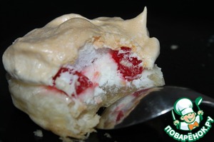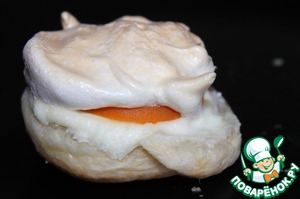 • Собрать пирожное. Основу из теста смазать творогом (по желанию и в зависимости от начинки, можно добавить сахар). Выложить начинку - сушеная вишня, половинки свежего абрикоса, клюква сушеная или в сахаре (будет сладко и липко, но вкусно) и т. д. Сверху выложить "шапку" из безе.