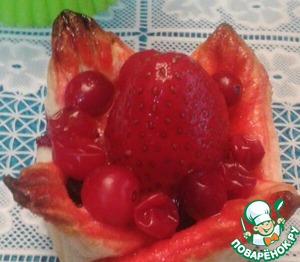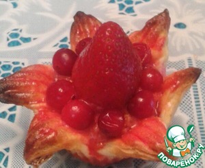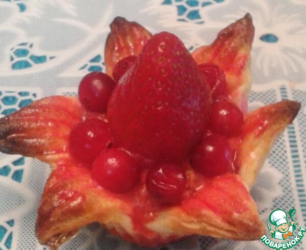 Дорогие друзья Поваренка! Предлагаю вам МК по изготовлению цветов из слоеного теста. Такие цветы будут прекрасно смотреться не только на вашей семейной трапезе, но и на праздничном столе. Вы можете придумать самую разнообразную начинку, а сегодня мы будем начинять цветы творогом с изюмом и миндалем, украшать ягодами.