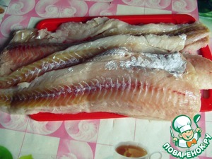Филе трески разморозить, разрезать вдоль на 2 части (для того, чтобы само филе было тоньше, а если филе тонкое достаточно, то резать не нужно). Натереть солью, специями, оставить на несколько минут (я оставляла, пока тушила лук с морковью и варила рис)
