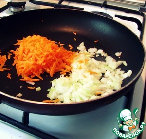 Пока филе пропитывается специями, натереть на крупной терке морковь среднего размера, нашинковать лук. Пассеровать их на сковороде до золотистого цвета лука, после - добавть в т жесковороду рис и налить воды. Оставить тушиться-вариться до готовности минут на 20 (или больше, если рис не проварился)
