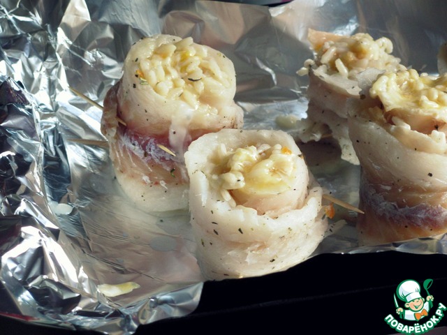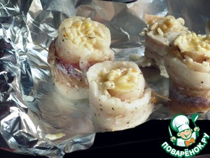 В наше, замаринованное в специях, филе выкладываем начинку из риса и скатываем в рулетики (скрепить на время приготовления можно и кулинарной нитью, но я использую чаще всего зубочистки). Выкладываем их на фольгу и отправляем в разогретую до 180 градусов духовку на 15-20 минут.