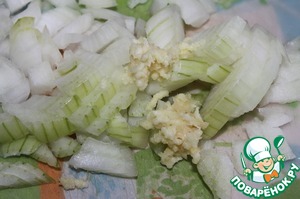 Лук и чеснок очистить, измельчить. Зелень вымыть и мелко порубить (у меня была сушеная).