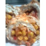 Вынуть корж из духовки, смазать кетчупом. Сверху разложить сосиски, посыпать сыром (немного сыра оставить). Свернуть в рулет и запекать еще 15-20 минут. За 5-7 минут до окончания приготовления посыпать рулет сыром сверху. -