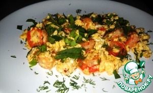 • Яично-масляную смесь выливаем к креветкам и жарим постоянно и интенсивно перемешивая не более двух минут, блюдо готовится очень быстро.