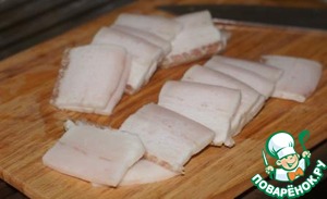 Нарезаем сало ломтиками, лук - полукольцами, картофель - кружочками.