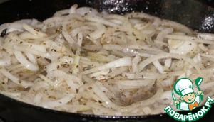 В вытопившееся сало добавляем специи. Я использовала прованские травы, белый перец и орегано. Выкладываем лук и слегка обжариваем.