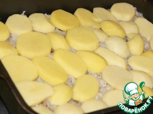 Форму для запекания смазываем сливочным маслом. Первым слоем выкладываем картошку. Солим, перчим.