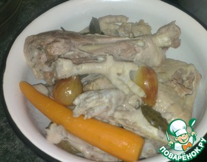 За 1.5 часа до окончания кидаем: морковочку, лук в шелухе, перец горошек, лаврушку.
