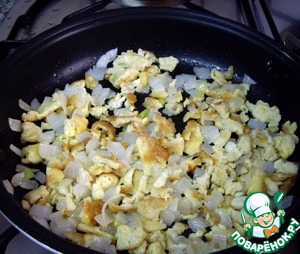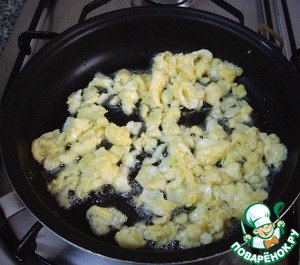 2 яйца взбиваем, выливаем на сковороду и разбиваем лопаткой на кусочки.