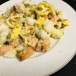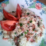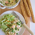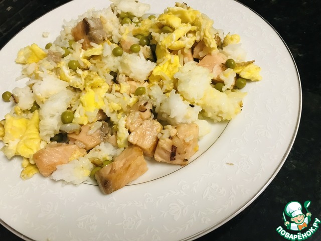 Лосось подкопченный режем довольно мелко и добавляем к рису.