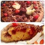 Тесто выкладываем в форму для выпечки, смазанную сливочным маслом, и разравниваем. Клубнику немного измельчаем (я разрезала на 4 части) и выкладываем на тесто.