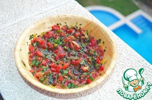 Базилик, помидор, перчик (очищенный от семян) мелко порубить. Смешать уксус с оливковым маслом. Полить смесью рубленые овощи, добавить соль и перец. Хорошо перемешать.