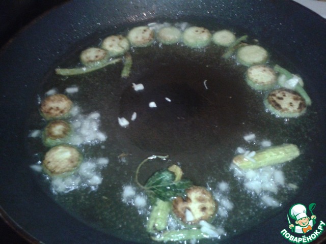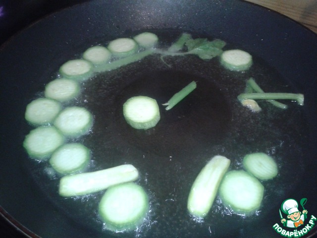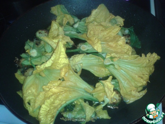 Через 1-2 минуты отправляем в сковороду порезанные цветки кабачков.