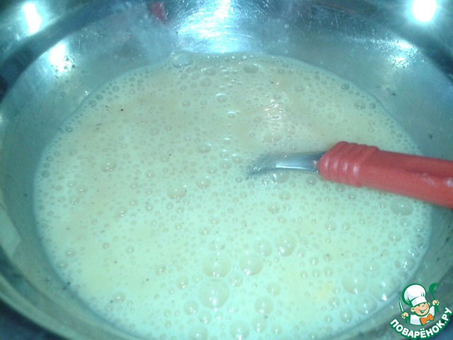 К моменту закладывания цветков, должна быть готова яичная смесь-взбиваем яйца, молоко, соль, перец.