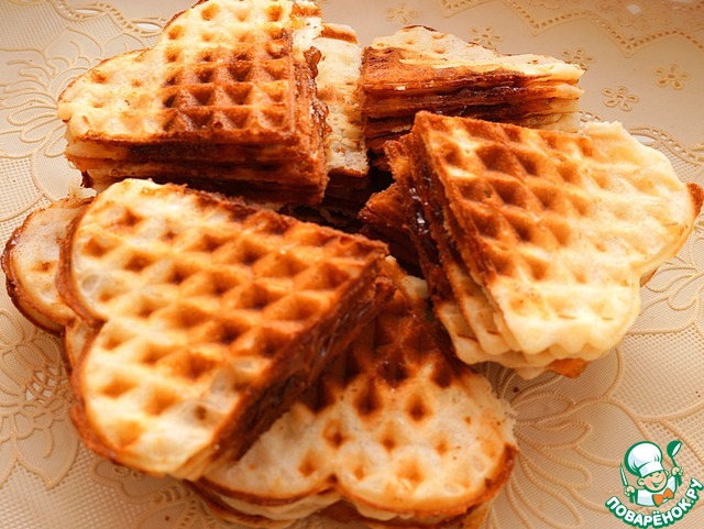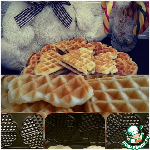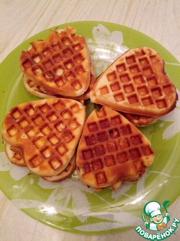 Разогрев вафельницу, слегка смазать маслом в первый раз, выложить тесто и выпекать примерно 4-5 минут (зависит от вафельницы). Из этого количества ингредиентов получилось 20 вафельных "сердечек".