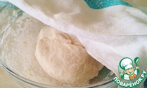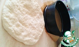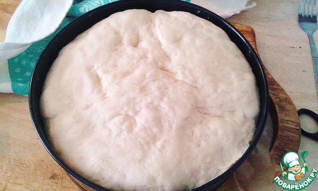 Дно круглой формы застелить бумагой для выпечки и смазать оливковым маслом. Из теста сформировать плоскую лепешку и уложить ее в форму - отставить в теплое место - подойти.