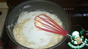 Далее вливаем в муку и масло небольшими порция молоко и тщательно перемешиваем.