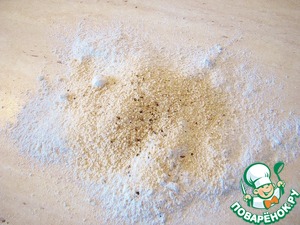• На столешницу всыпаем ржаную муку, панировочные сухари, немного молотого перца и соли - подмешиваем.