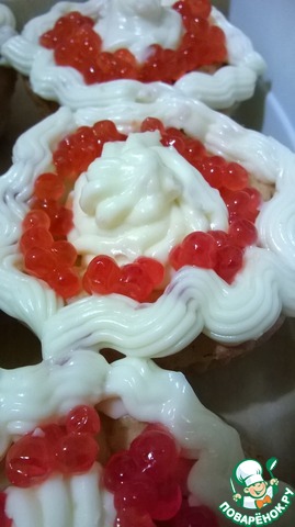 4. Запечь в разогретой до 180С духовке до готовности, примерно 15-20 минут. Если большие формы, то время выпечки увеличить. Готовые кексы немного остудить. Затем сверху отсадить немного сливочного сыра и украсить икрой.