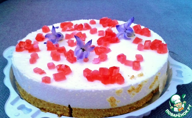 Нежный, охлаждающий в летнюю пору тортик. К тому же очень красивый в разрезе. Готовила на День рождения мужа. Рецепт взят с сайта "Одноклассн ики". В оригинале у автора (к сожалению он не указан), торт с киви, но у нас в продаже нет желе зеленого цвета, да и не сезон киви. Поэтому у меня красный виноград. На сайте поискала, но ничего похожего не нашла.