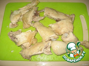 Вареную курицу вынуть из бульона и разделить на нужные кусочки.
