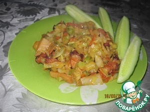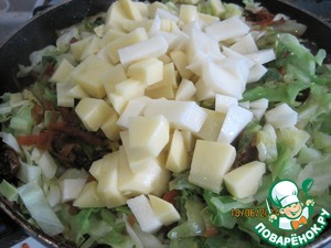 Добавить капусту, посолить и тушить не убавляя огня до появления водички ( капуста даст сок)...