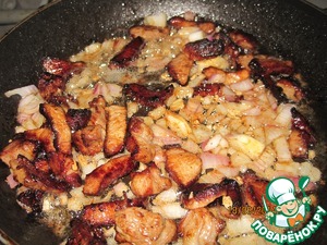 Обжарить мясо до золотистой корочки ( потом капуста примет такой же цвет), добавить рубленный чеснок, порезанный кубиками лук...